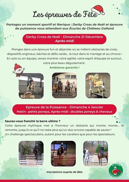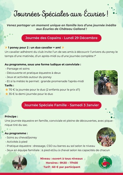 Pour des inscriptions en stages lors des vacances, ou pour des renseignements et inscriptions aux concours veuillez envoyer un mail à lesecuriesdechateaugalland@orange.fr